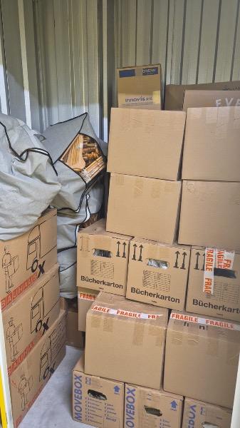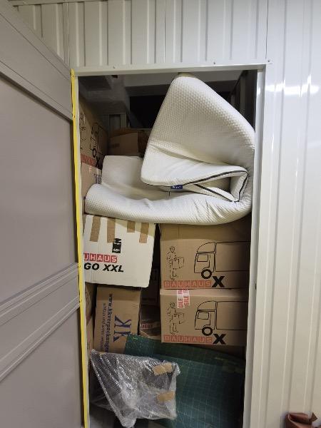 2 chairs 1 mattress topper 4 packing bags with hangers or clothing (grey on the pictures 5 smaller boxes with toys (livery boxes on pictures) =Total load fits in a 5 sqm storage unit |