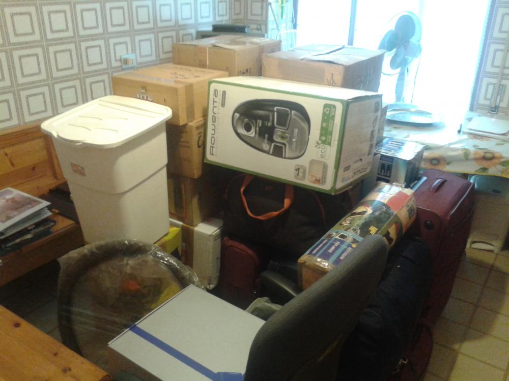| Description: | Abbiamo aggiunto delle foto: il volume totale di scatole + bagagli è di 2 metri cubi. A questo volume vanno aggiunti 1 scrivania smontata (piano 80x80cm + piede alto 70cm), 1 bici con ruote smontate, 1 sedia come da foto, 1 stendino, 1 asse da stiro piccolo. |